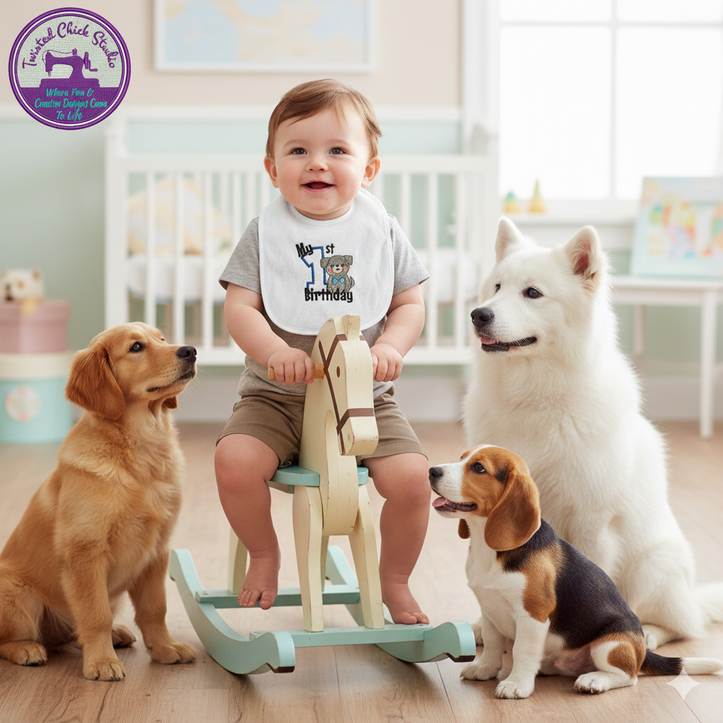 Watch your pup-loving birthday boy strut his stuff in this charming 2-ply white terry cloth bib!