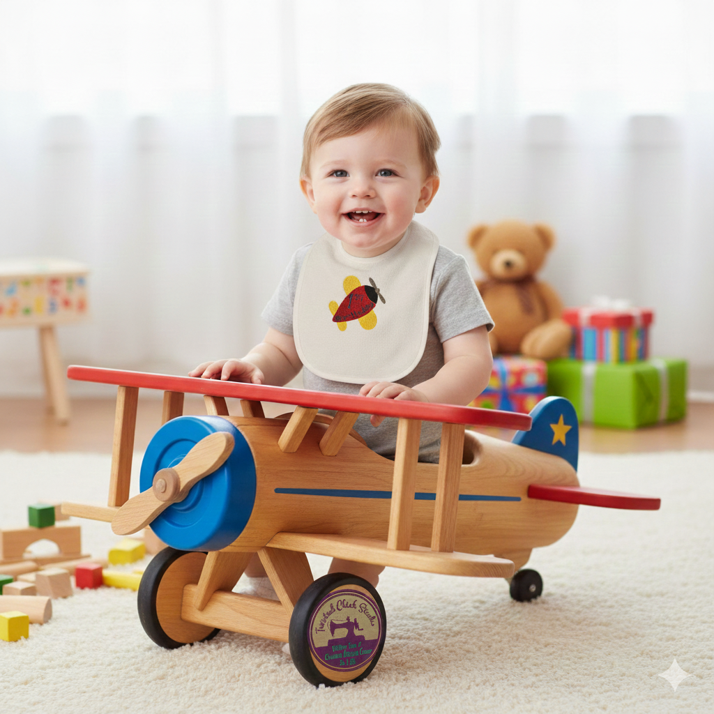 This soft 2-ply white terry cloth bib features an adorable embroidered airplane design, perfect for capturing messy milestone moments in style.
