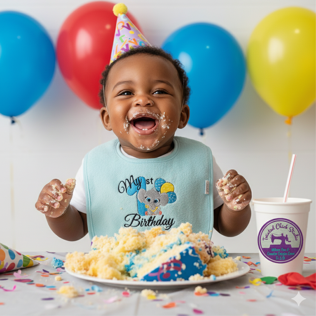 Celebrate your little one's first milestone in style with this adorable bluish green colored terry cloth bib! Featuring a charming embroidered elephant surrounded by colorful balloons and the number 1 in blue, it's the perfect keepsake for "My 1st Birthday" photos.