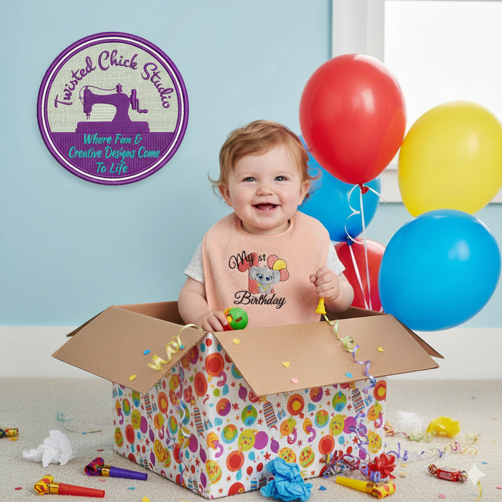 Celebrate your little one's first milestone in style with this adorable peach colored terry cloth bib! Featuring a charming embroidered elephant surrounded by colorful balloons and the number 1 in pink, it's the perfect keepsake for "My 1st Birthday" photos. Made from soft, absorbent 2-ply terry cloth, this bib keeps messes at bay while the convenient velcro closure ensures a secure, adjustable fit. A delightful gift that captures the magic of that special first year!