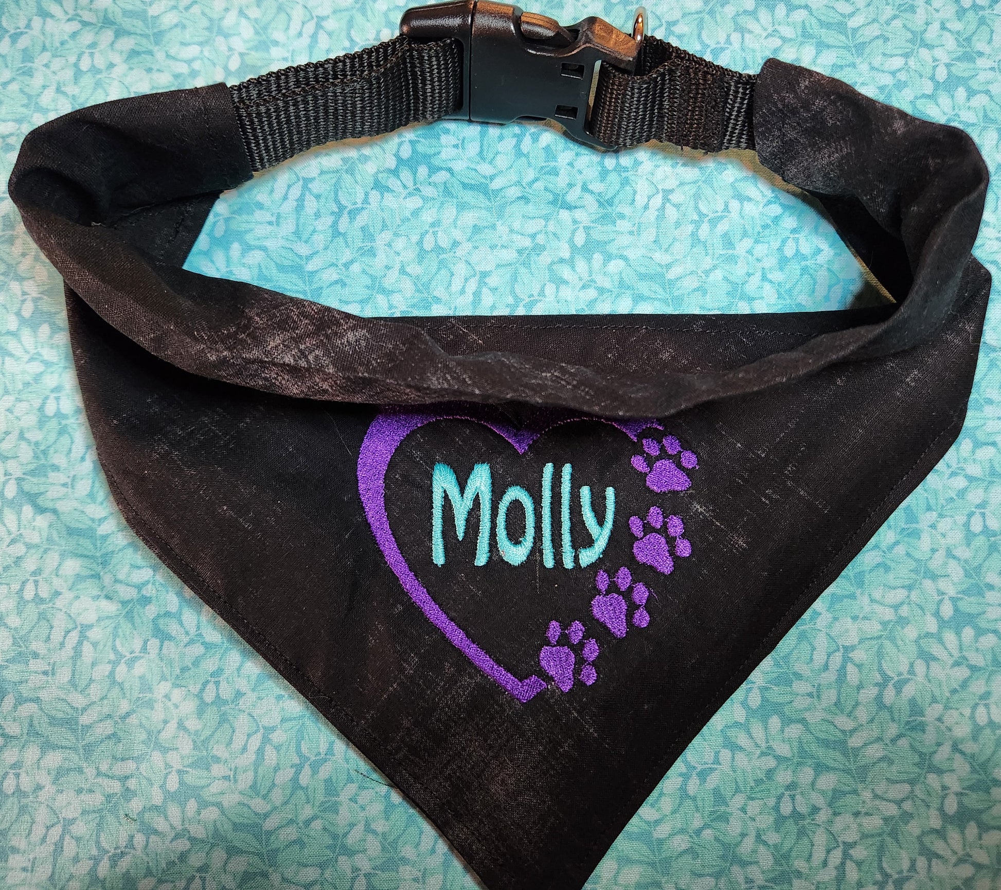 Bandana's will be stitched in complementary colors to the color of the bandana fabric unless otherwise specified. There is no extra change for custom colors; If you would prefer custom colors in the design please contact me prior to ordering. If you want to add a name please contact me to confirm your color choices an name. There is a $2.00 charge for adding a name.